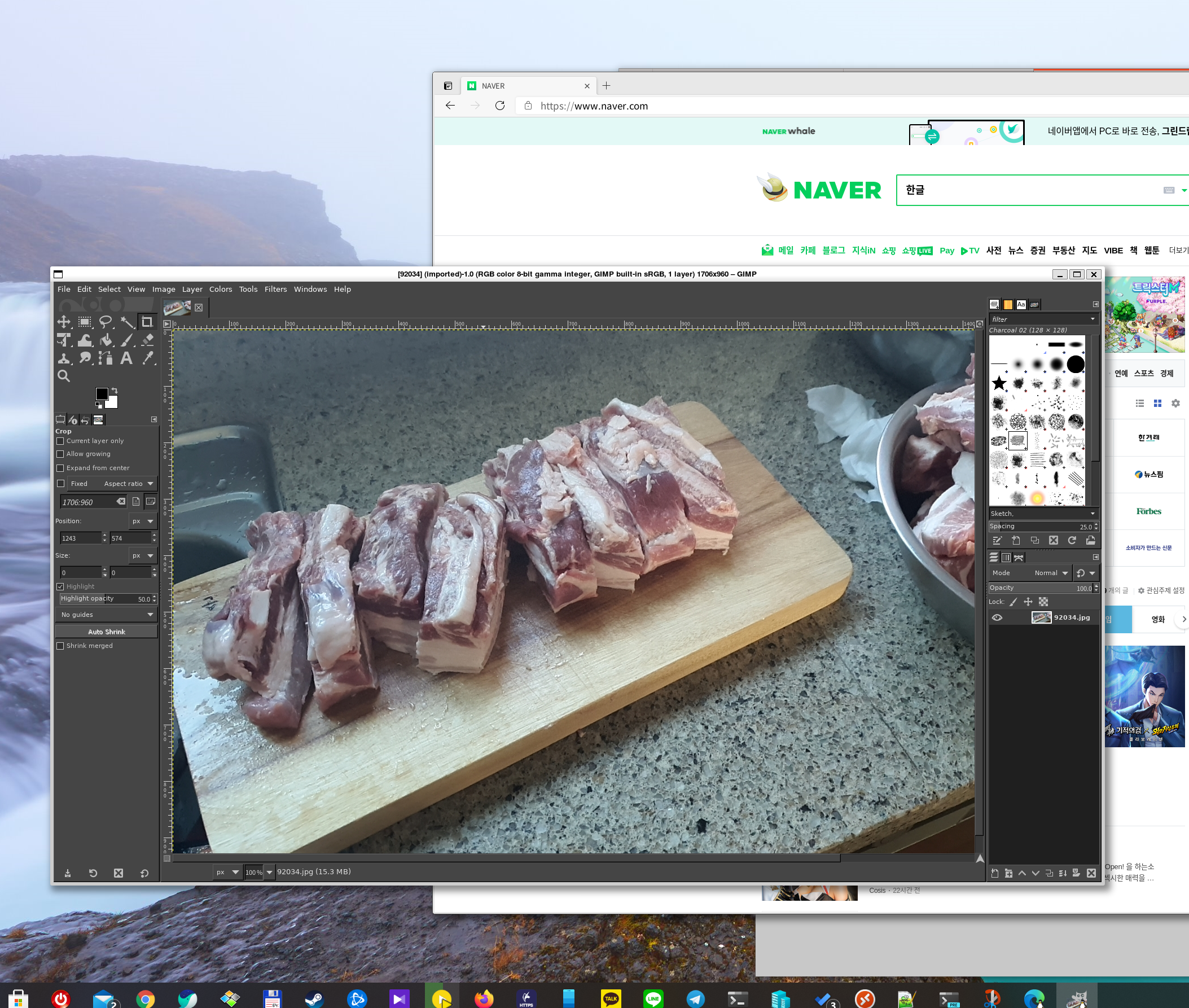 윈도우에서 gimp와 엣지를 바로 실행 시킨 모습 , 엣지 창에서 한글까지 입력 잘 됨