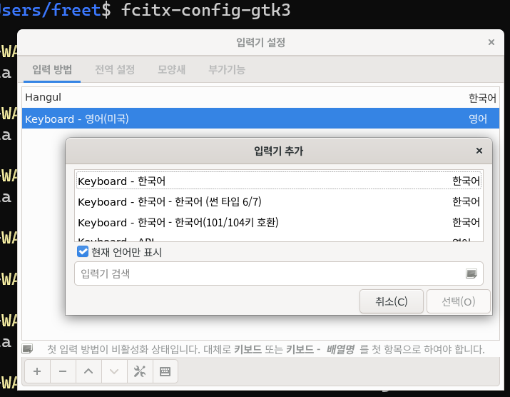 #아래 명령어 실행해서 한글 입력기 추가 되어 있는 지 확인