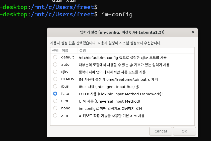 sudo apt install fcitx fcitx-hangul fonts-noto-cjk dbus-x11