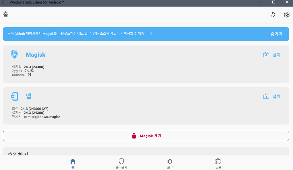 https://github.com/LSPosed/MagiskOnWSA 에 올라와 있는 파일을 이용함